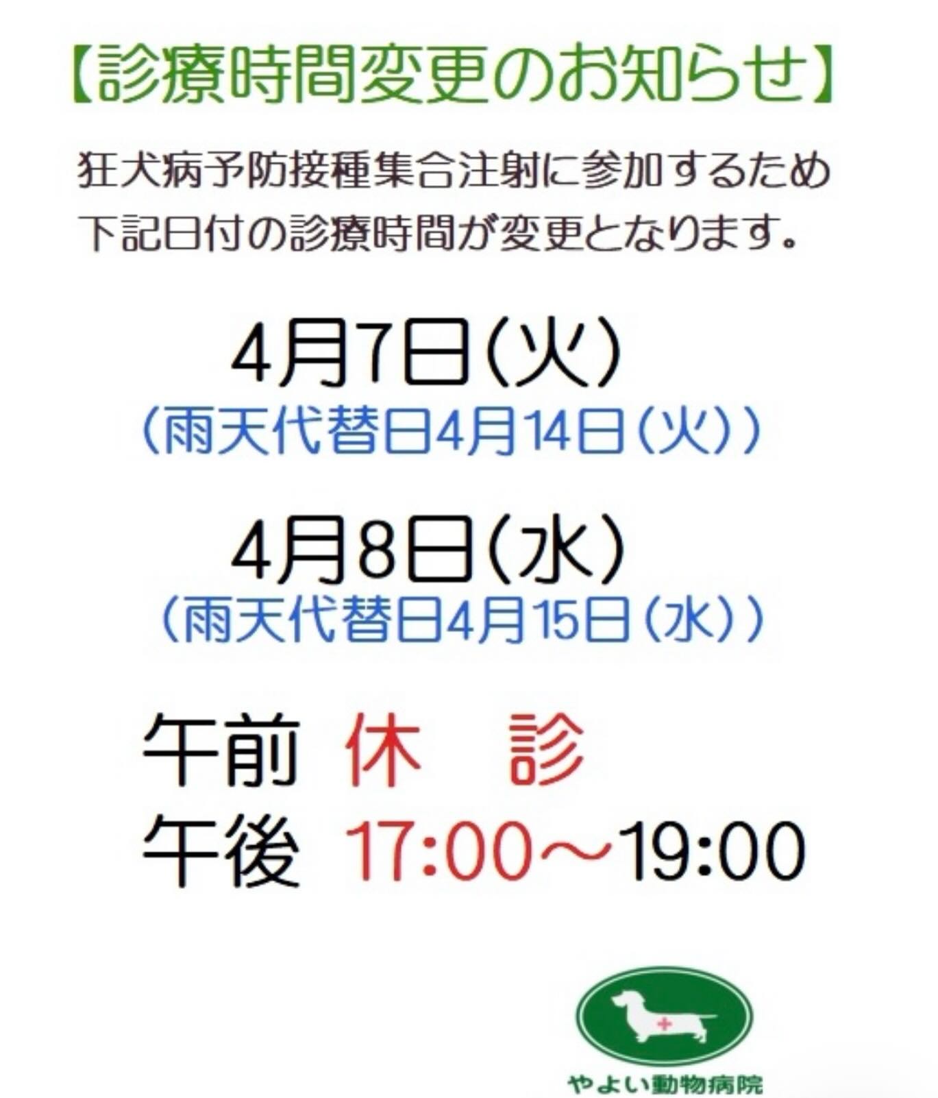 4/7(火)・4/8(水)は狂犬病予防接種集合注射参加のため17:00-19:00のみの診療時間となります